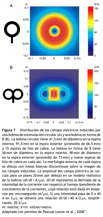 En la EMT, se aplica un pulso de corriente eléctrica, procedente de un condensador, que fluye a través de una bobina de hilo conductor de cobre, recubierta de una carcasa de plástico, situada sobre la cabeza del paciente, generando un campo magnético perpendicular a la misma (fig. 6). La frecuencia de cambio de este campo magnético determina la inducción de una corriente eléctrica secundaria en cualquier material conductor cercano6,15-20. En el momento en que un pulso de corriente es conducido por la bobina de estimulación, se establece un campo magnético que pasa a través del cuero cabelludo y la calota craneal sin atenuarse (solamente decae con el cuadrado de la distancia). Las bobinas de estimulación más utilizadas son la circular y la que tiene forma de 8. La bobina circular produce un campo eléctrico más amplio, posibilitando la estimulación simultánea de los 2 hemisferios cerebrales. En cambio, la bobina en forma de 8 determina un campo electroestimulador más localizado (fig. 7)6,15-22. Estos pulsos magnéticos de intensidad específica dan lugar a una despolarización selectiva de neuronas de la corteza cerebral, ubicadas 1,5-2 cm por debajo de la bóveda craneal. La corriente eléctrica actúa sobre las neuronas inhibiendo o estimulando sus efectos, modulando la energía obtenida a partir de sus orgánulos mitocondriales y