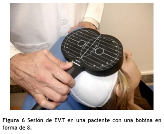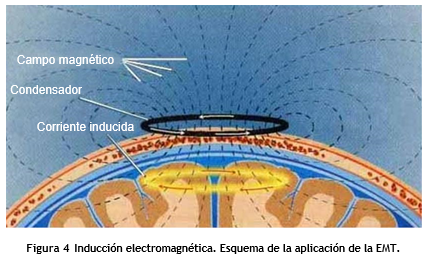 La EMT es una forma no invasiva de estimulación de la corteza cerebral, erigiéndose como una herramienta técnica que amplía el abanico de posibilidades de estudio e investigación en neurociencias, y en el tratamiento de diversas enfermedades neuropsiquiátricas. Permite la estimulación segura, indolora e incruenta del tejido nervioso (corteza cerebral, médula espinal, vías motoras centrales y nervios periféricos), además de regular de forma controlada la actividad cerebral (fig. 4). Entre los cambios derivados de la interacción de la EMT con la unidad celular-funcional cerebral que posee actividad eléctrica (la neurona), se encuentran los siguientes: electrofisiológicos (potenciales de membrana), bioquímicos y moleculares (senalización, ˜ neurotransmisores, genes, etc.) y celulares (crecimiento, diferenciación, etc.). Asimismo, la EMT también ejerce efectos sobre la conducta, el humor, la memoria, la mielinización y la NP6,15,16.