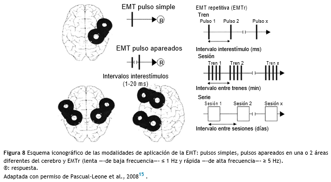 — La estimulación magnética transcraneal repetitiva (EMTr) crea un tren de pulsos de baja (≤ 1 Hz, con un rango de 0,5-1 Hz) o alta frecuencia (≥ 5 Hz, con un rango de 5-20 Hz), durante tiempos muy cortos (milisegundos), proporcionando la capacidad de producir cambios en la excitabilidad corticoespinal, ocasionando efectos reguladores neuronales que perduran más allá del tiempo que abarca la propia sesión de EMTr. Estas propiedades la han convertido en la modalidad de EMT más empleada con fines terapéuticos.
